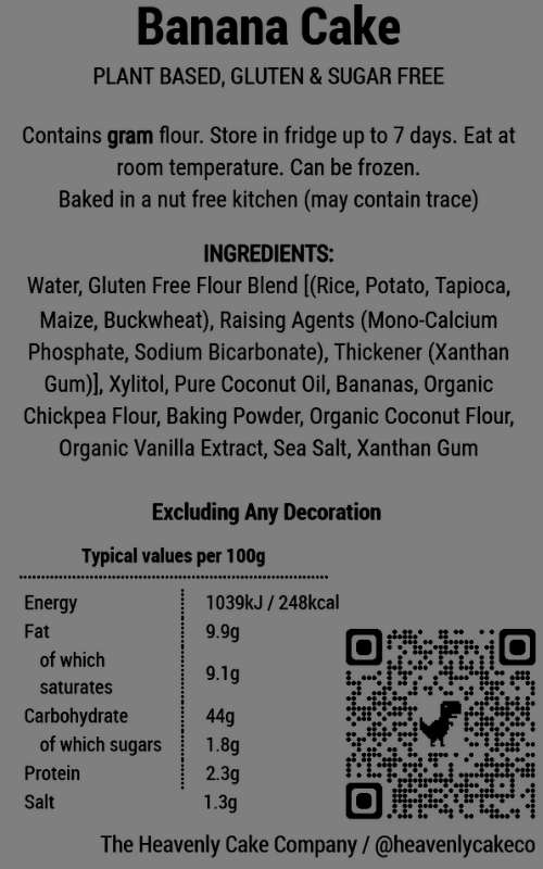 Nutritional info. This cake comes with a coconut based topping.  Sweetened with xylitol which is lower calorie and suitable for diabetics, but not suitable for babies or pets. Note that xylitol can have a laxative effect if eaten in excess.